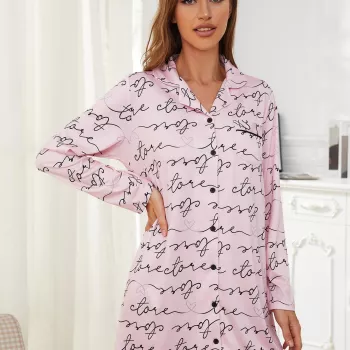 Chic Women's Letter Print Nightgown - Button-Up Sleepwear with Long Sleeves